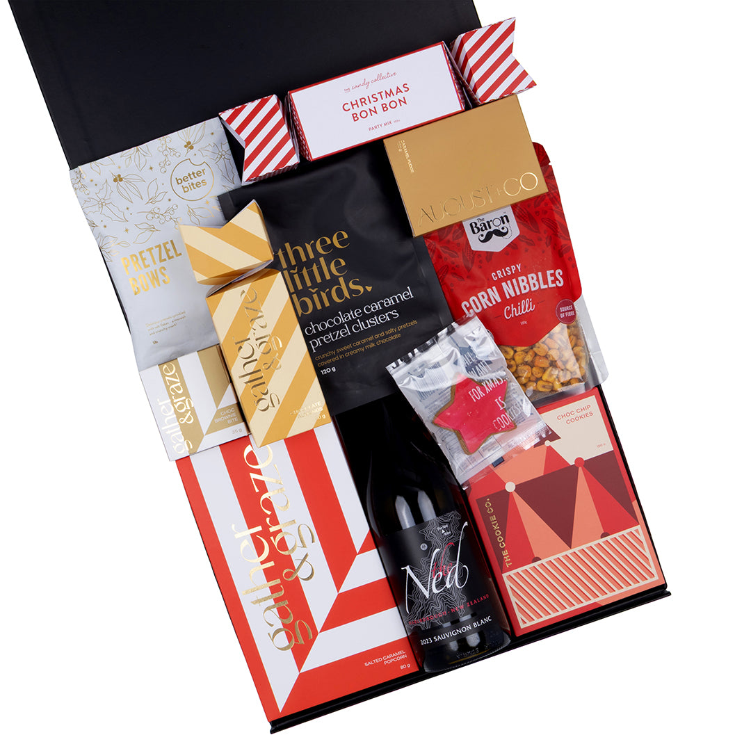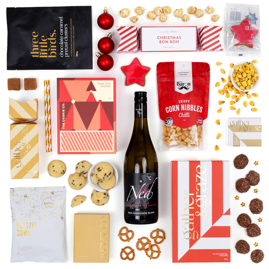 Ring in the season with The Jingle Bells, a festive hamper filled with wine, sweet indulgences, and savoury bites. From a bottle of The Ned Sauvignon Blanc to Christmas cookies, fudge, popcorn, and classic gingerbread, this gift is bursting with holiday cheer. A well-balanced mix of flavours and festive favourites, it’s a thoughtful way to celebrate with friends, family, or colleagues.