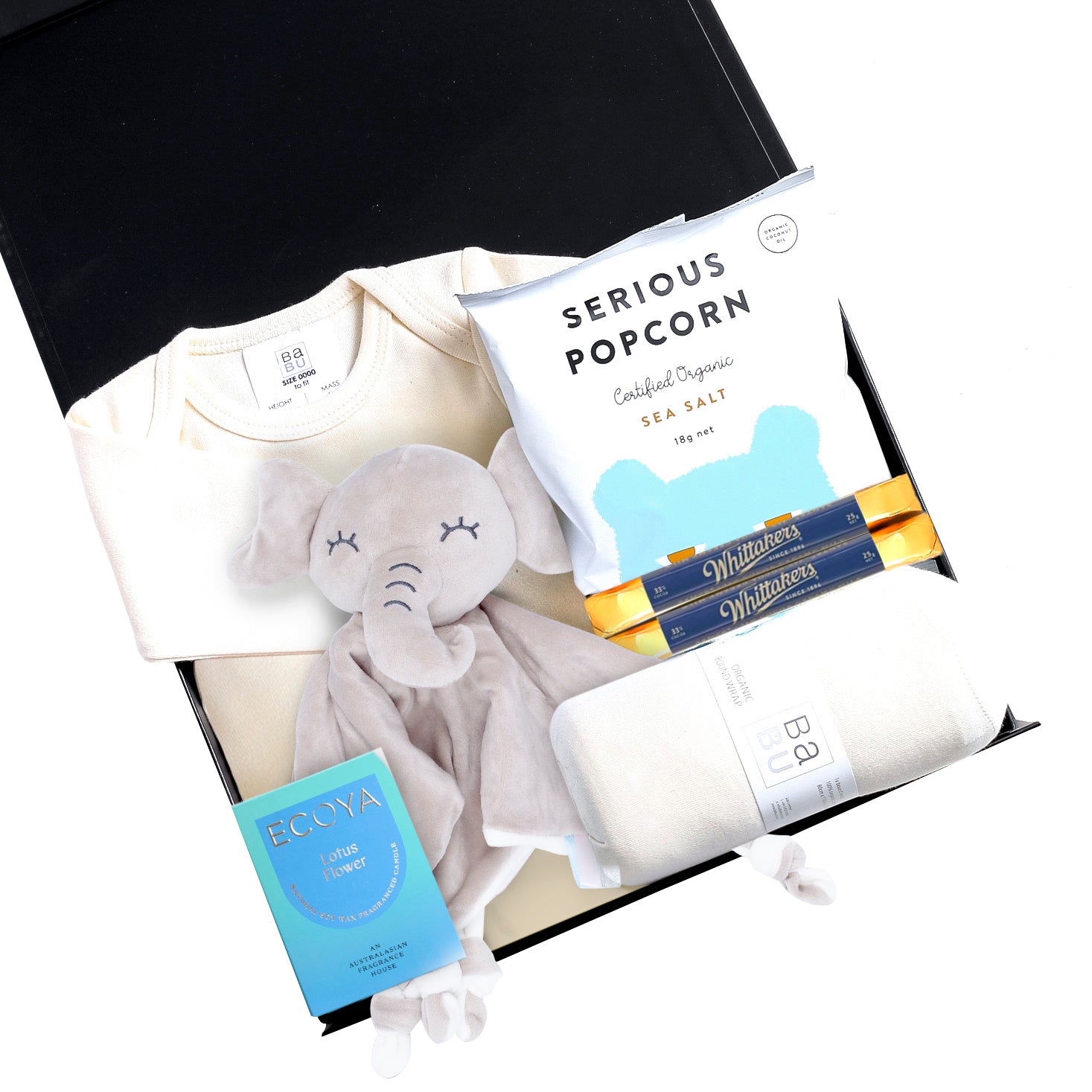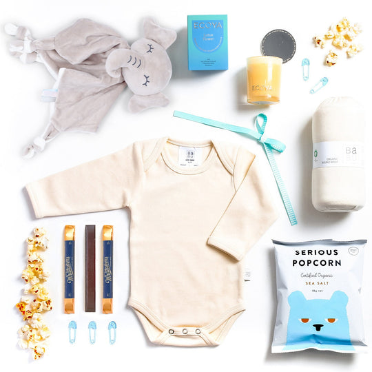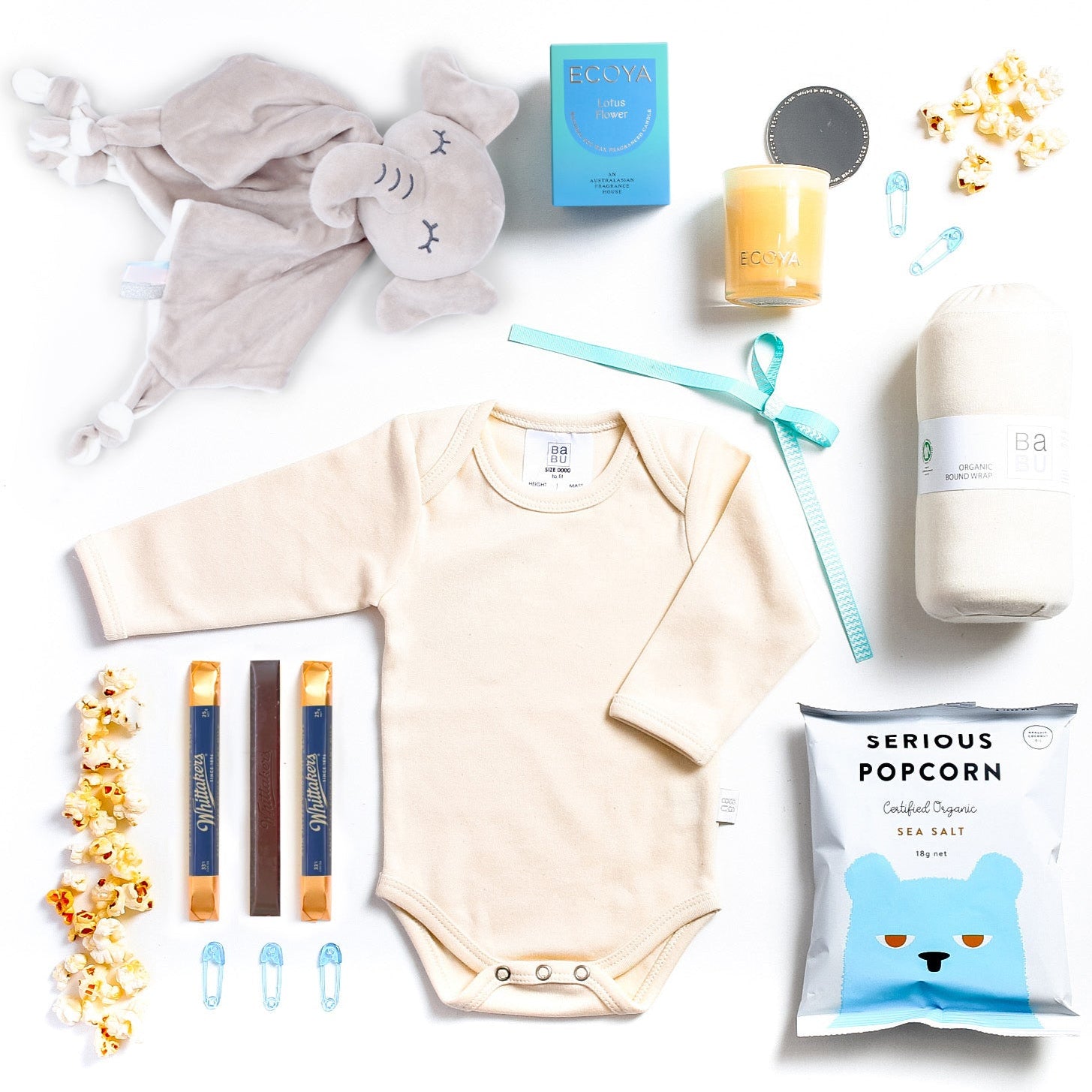 Snips and snails and puppy-dogs' tails. Celebrate the arrival of a precious baby boy with this gorgeous gift hamper, filled with treats for both Mum and baby. Organic cotton goodies from Babu, along with an ECOYA candle and gourmet goodies for Mum will go down a treat! Perfect for celebrating the birth of a newborn baby boy.