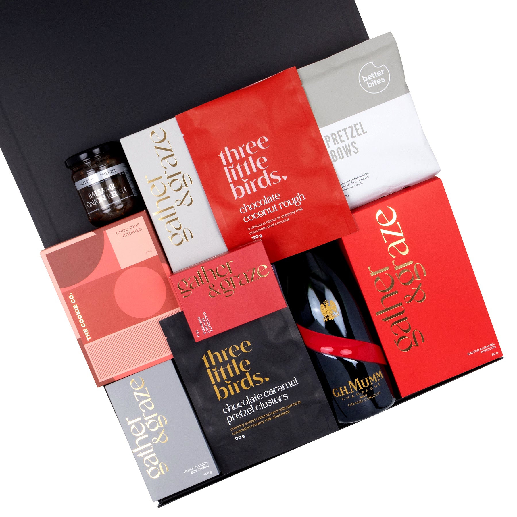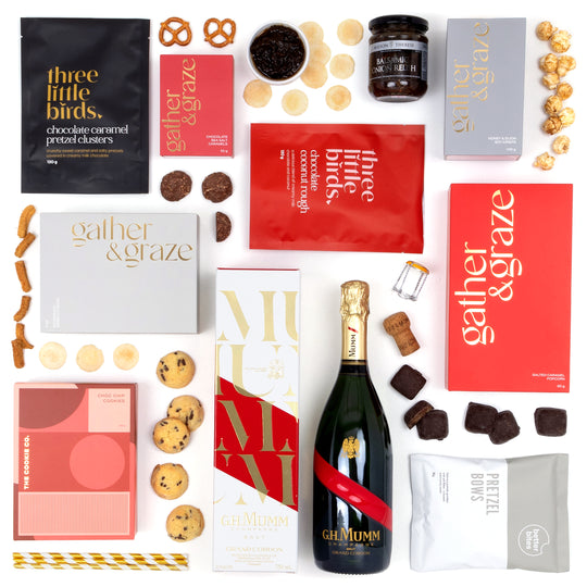 The Champagne Celebration is the perfect way to mark life’s special moments. Featuring a bottle of Mumm Grand Cordon Champagne, this gift box pairs elegant bubbles with a thoughtful selection of savoury bites and sweet indulgences. From gourmet wafers and honey soy crisps to rich chocolates, cookies, and popcorn, it’s a hamper that’s as festive as it is delicious. A sparkling gift to impress and delight for any celebration.