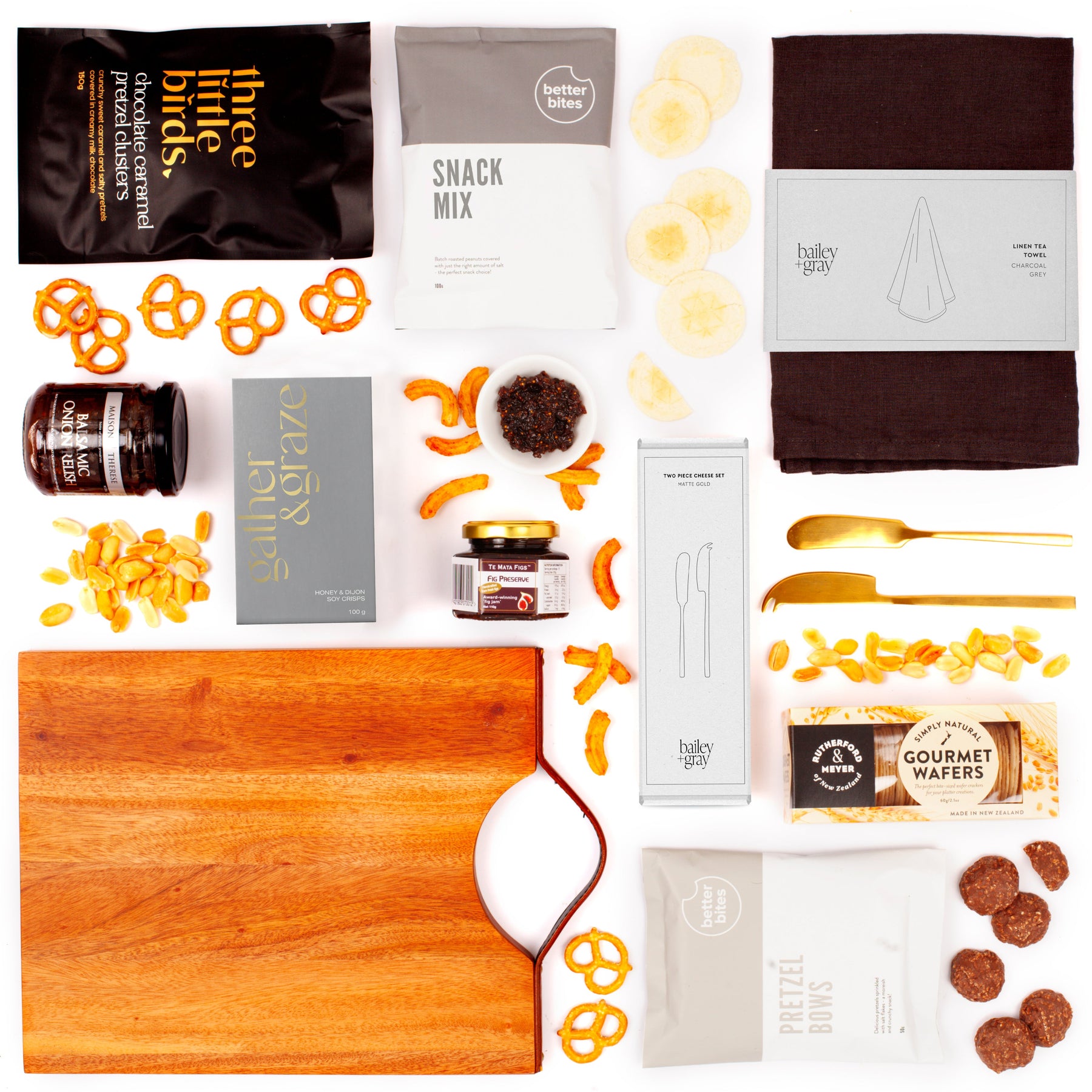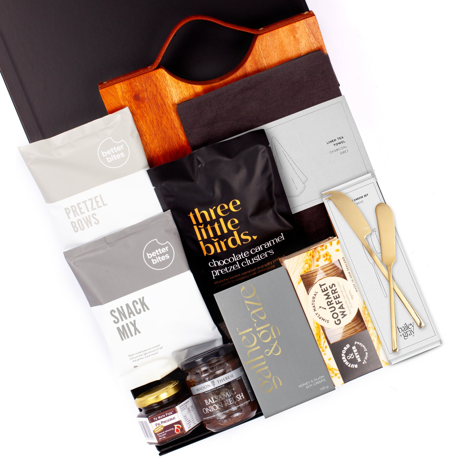 A luxury gift basket filled with all of the entertaining essentials - a wooden serving board for guest nibbles, crackers, relish, chocolate clusters and so much more. Packaged to perfection in our signature modern gift boxes, The Platter Perfection makes for the perfect gift for a range of occasions.