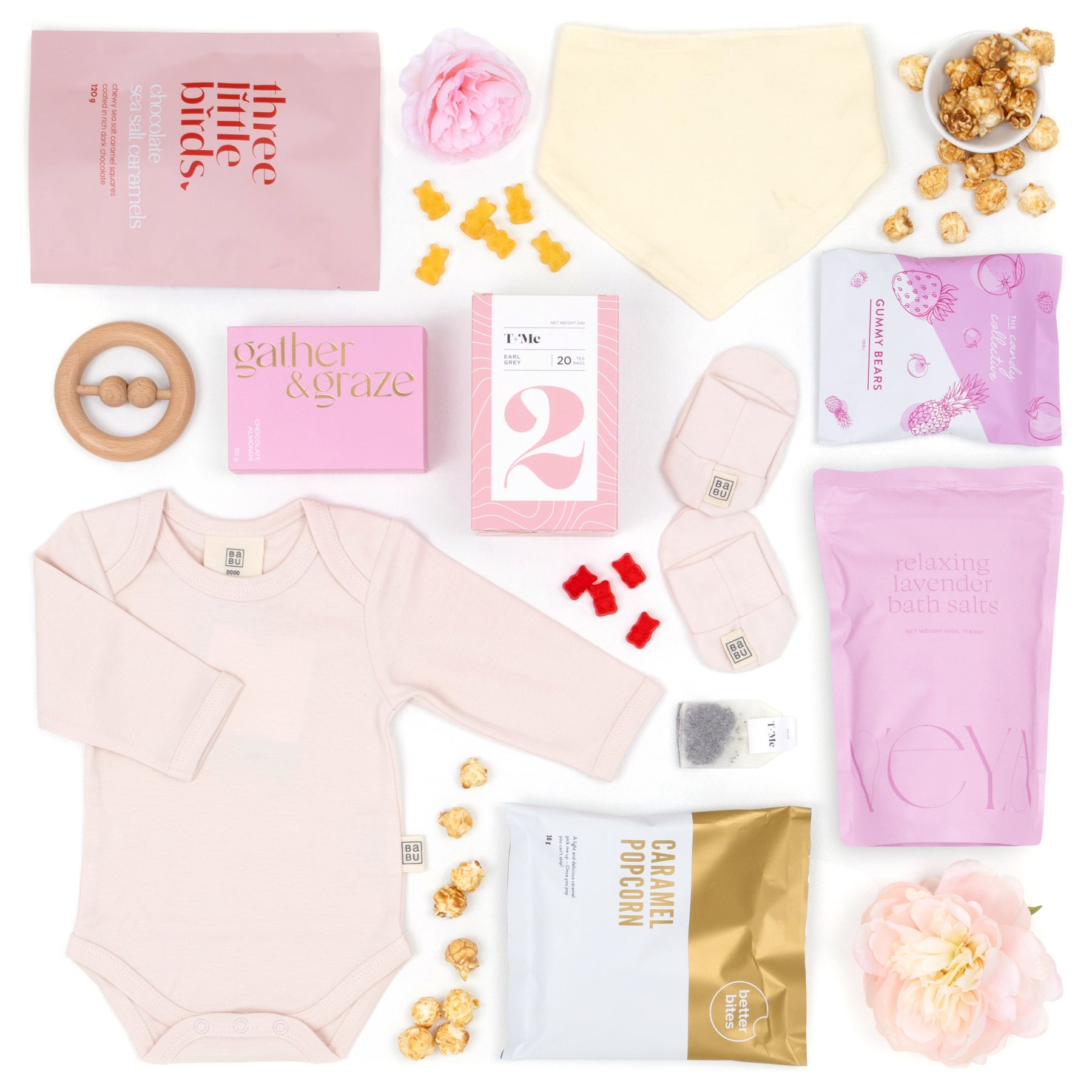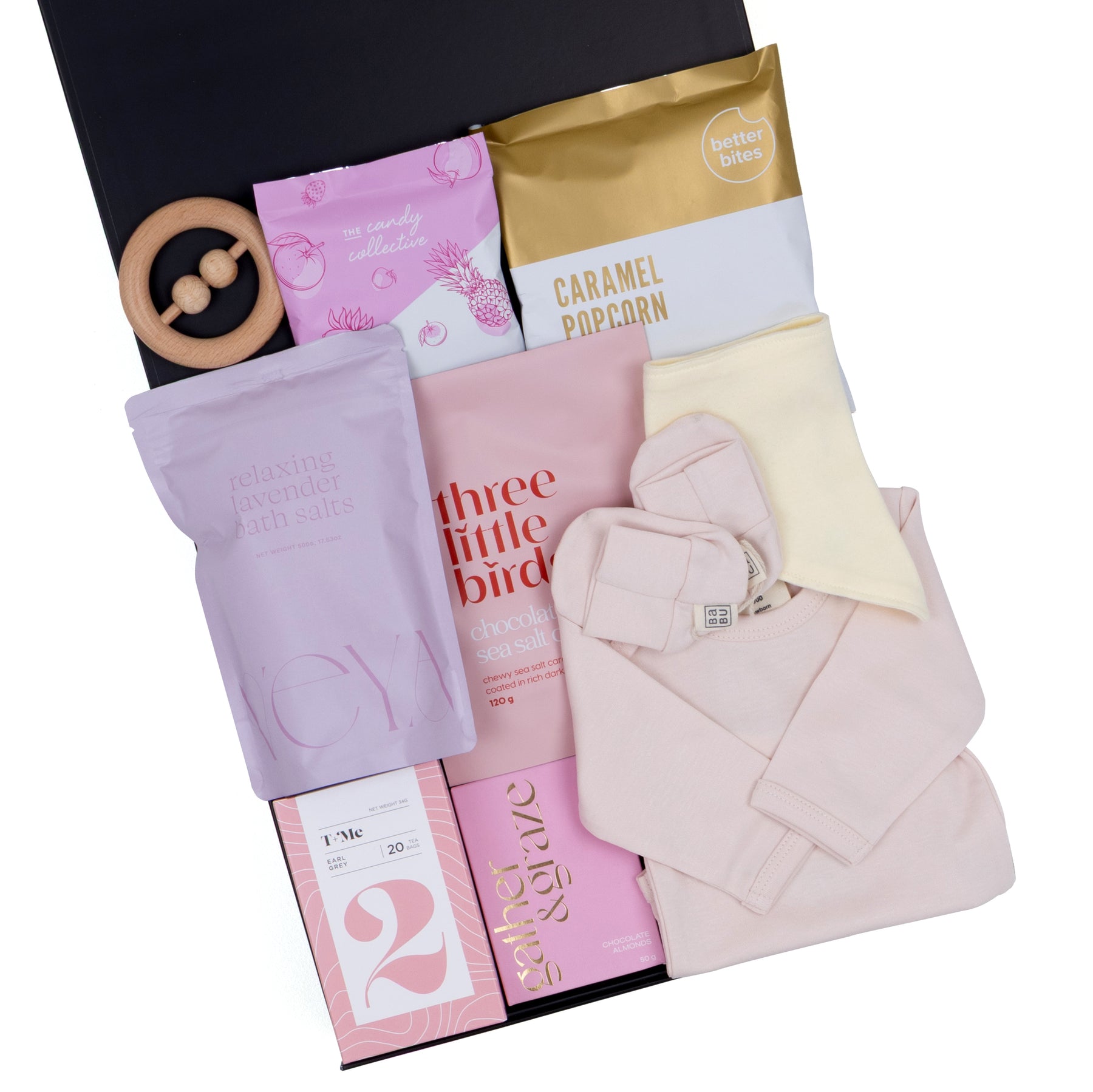 Welcome a precious new arrival with The Sweet Baby Girl, a beautifully curated gift box celebrating softness, warmth, and joy. Perfectly suited for new parents, this thoughtful collection includes delicate baby essentials crafted by Babu, a pink bodysuit, cozy booties, and a natural teether ring. A Bailey + Gray bib adds a practical touch, while a mix of soothing and indulgent treats, lavender bath salts, tea, chocolates, and gourmet popcorn, bring calm and comfort to the new mum. Presented with care and designed to impress, it’s the perfect way to celebrate the arrival of a little girl in style.