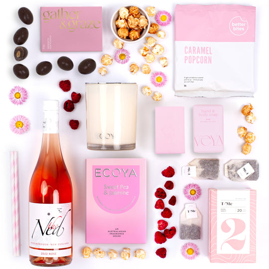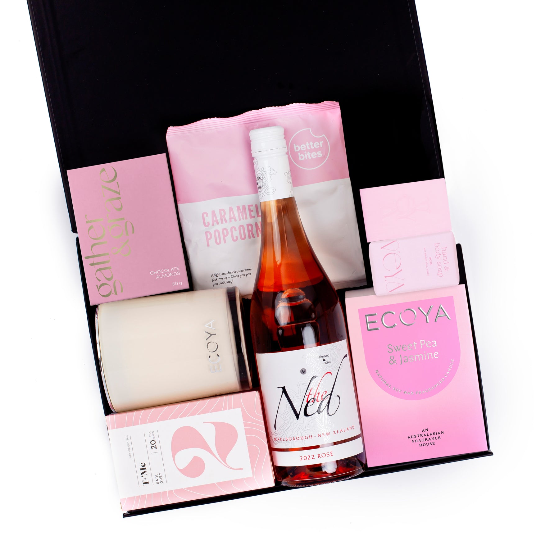The Sweet Pea gift box is the perfect way to say thank you, celebrate love, or simply spoil someone special. Featuring ECOYA’s signature candle, a bottle of refreshing rosé, and a curated mix of sweet treats and pampering essentials, this box is all about beauty in the little moments.