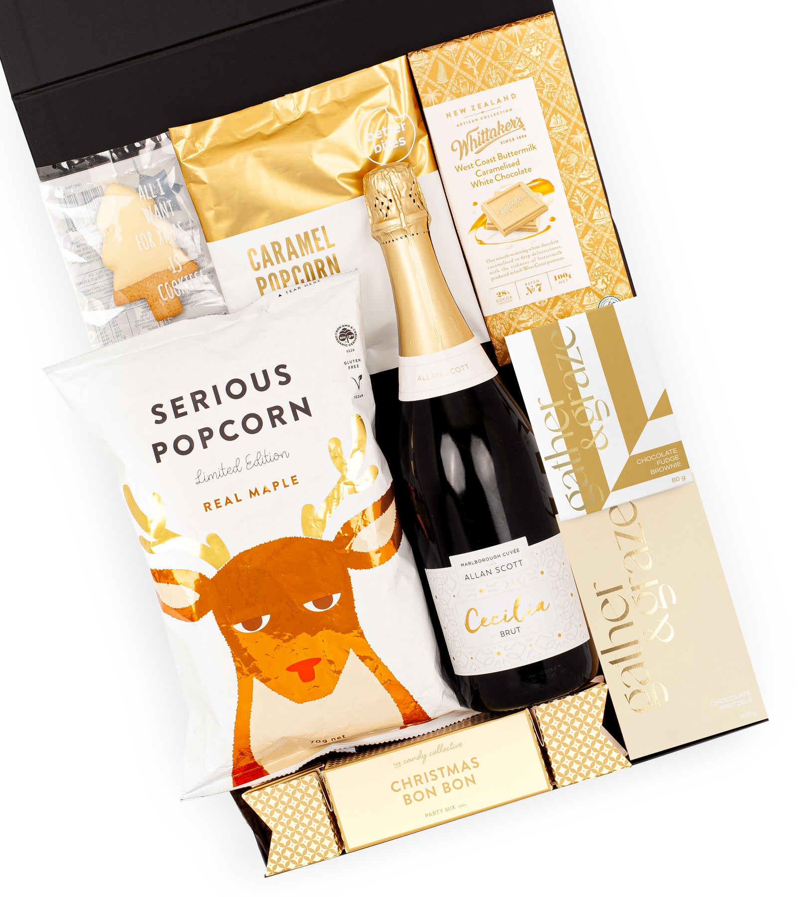 Celebrate the season with The White Christmas, a festive gift box inspired by the magic of a white Christmas. Featuring a bottle of Allan Scott Cecilia Brut and paired with indulgent white chocolate, fudge brownie, gingerbread, and popcorn, this hamper blends elegance with festive fun. A thoughtful gift that’s perfect for sharing and raising a glass to the holidays.