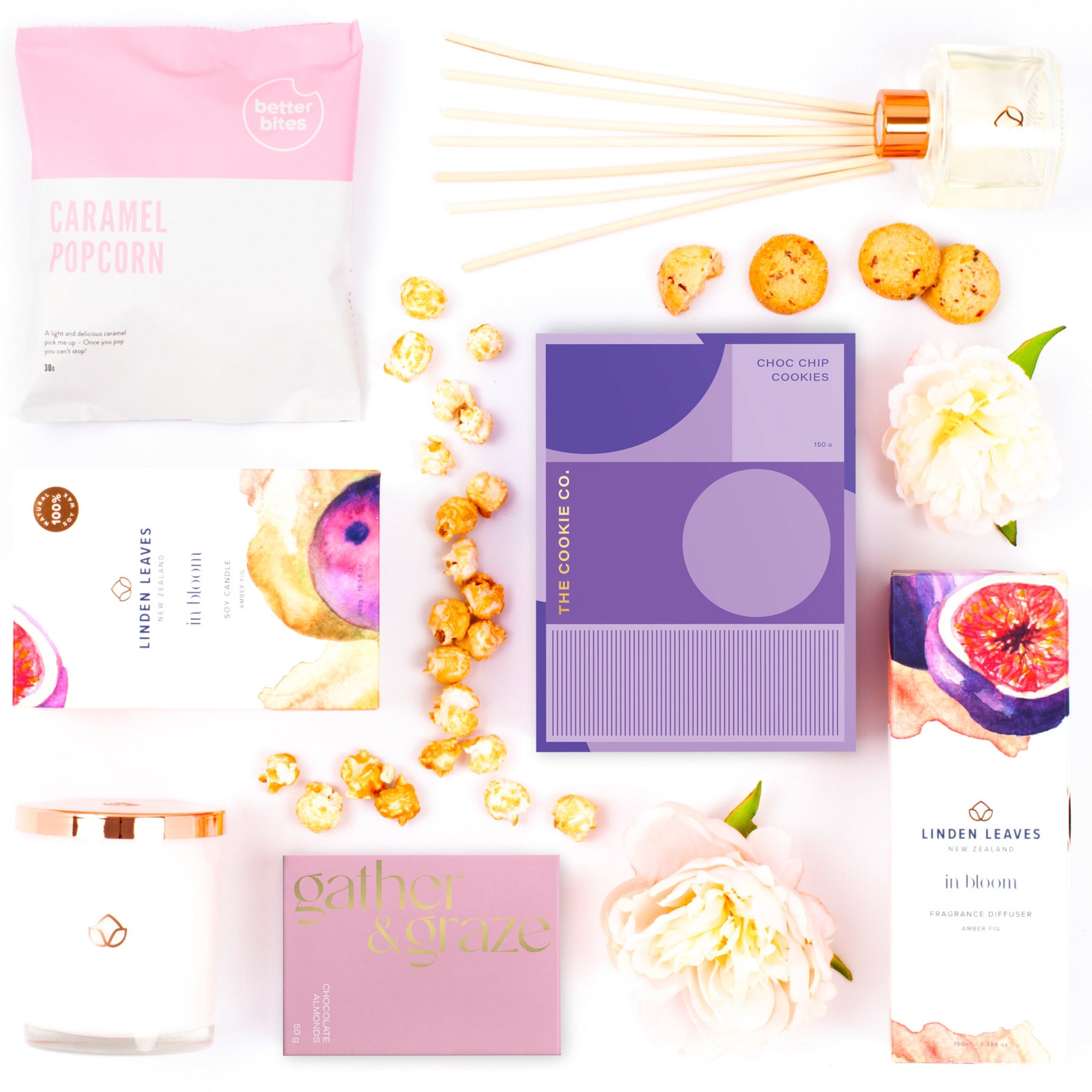 The Linden Leaves In Bloom gift box is an elegant way to bring warmth, fragrance, and a little indulgence into someone’s day. Featuring the rich Amber Fig scent in both a soy candle and diffuser, this gift creates a calming, inviting atmosphere at home. Paired with a mix of sweet treats, including a classic choc chip cookie, chocolate almonds, and caramel popcorn, it balances luxury with comfort. A thoughtful present for birthdays, thank-yous, or simply to brighten someone’s space with lasting fragrance and flavour.