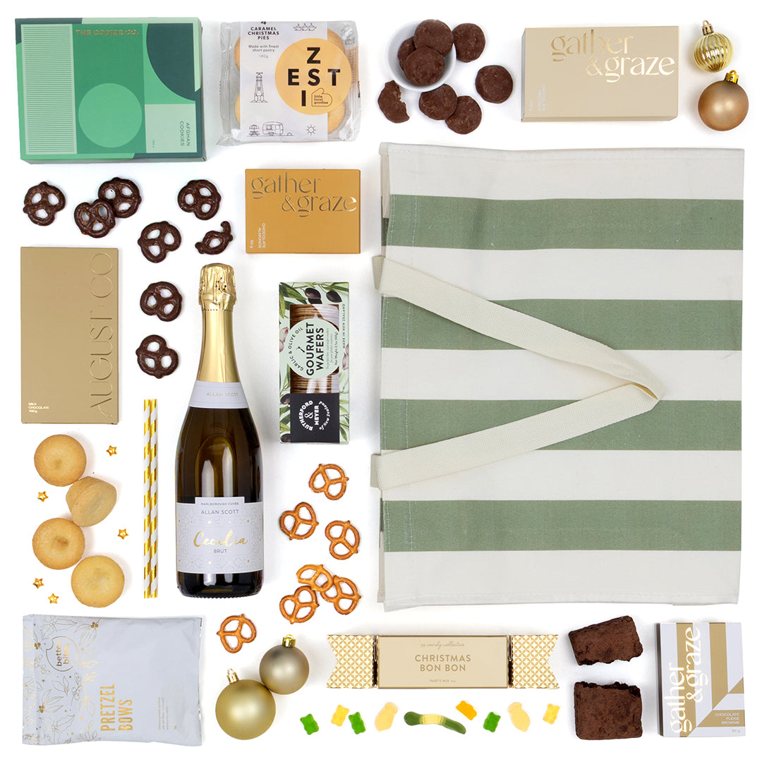Celebrate Christmas in true Kiwi style with The Christmas Tote, a festive collection of sweet and savoury favourites paired with a bottle of Allan Scott Cecilia Brut NV. Packed inside a reusable striped canvas tote, this gift is both practical and indulgent – perfect for summer picnics, beach days, or family gatherings. With everything from Christmas pies and party mix to artisan chocolate and crackers, it’s a versatile gift that captures the joy of a New Zealand Christmas.