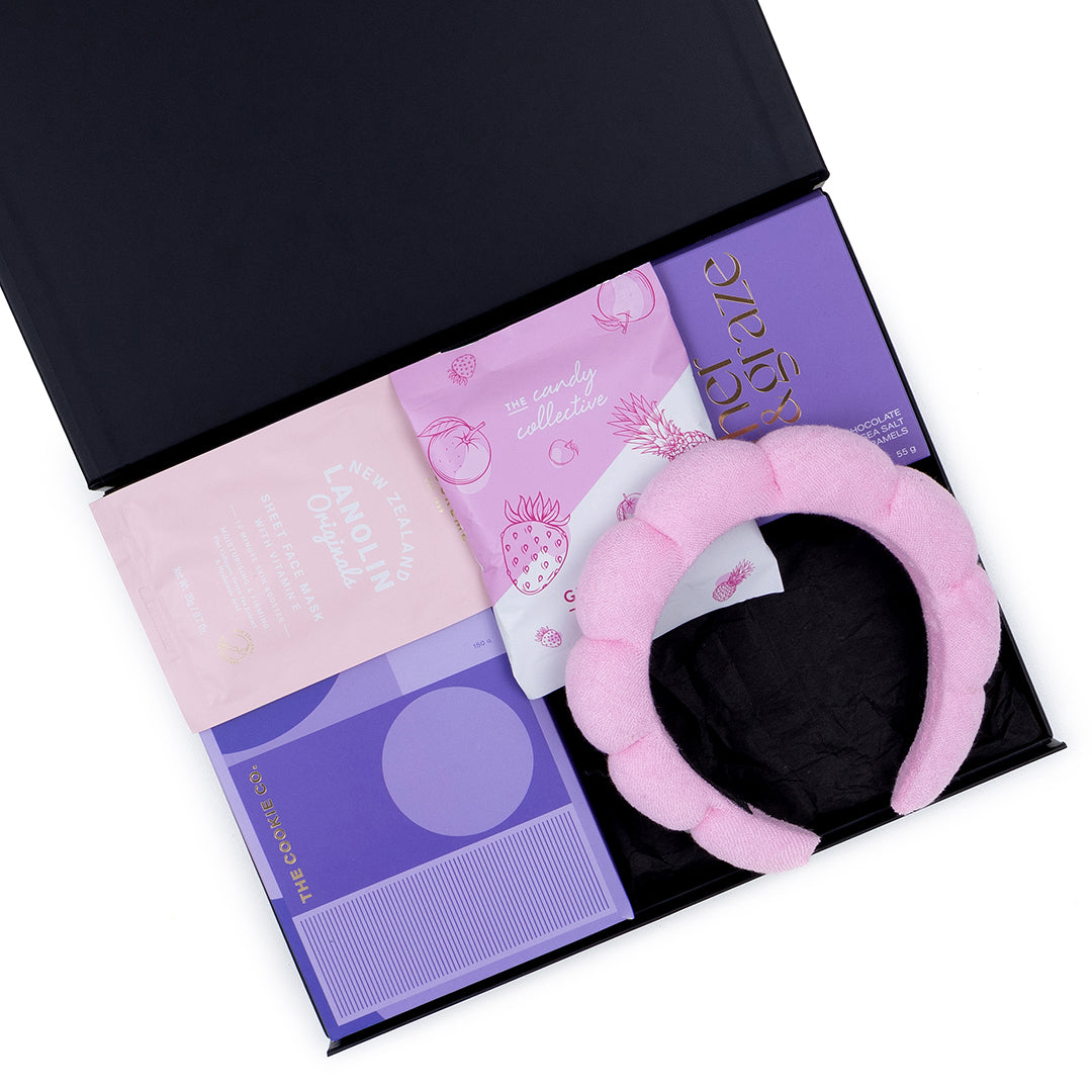 The Get Ready With Me gift box is the perfect pick-me-up for a pampering night in or a thoughtful self-care surprise. Designed for those who love a touch of luxury in their everyday routine, it features a soft VEYA pink terry beauty headband, a rejuvenating Lanolin Originals Vitamin E Sheet Mask, and a delicious mix of sweet indulgences to enjoy while you unwind. A little glam, a little treat — and a whole lot of comfort.