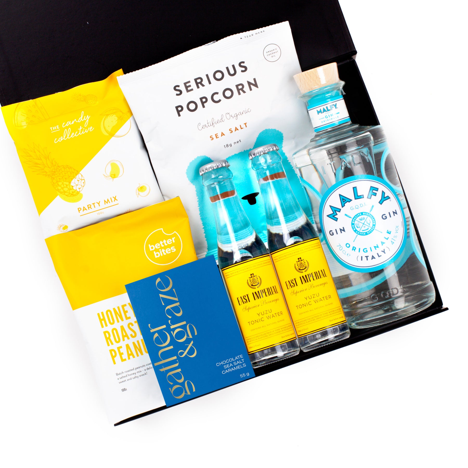 Fresh, crisp, and perfectly balanced, The Gin and Tonic gift box is a celebration in a glass. Featuring Malfy Originale Gin paired with East Imperial Yuzu Tonic, this box is elevated with a mix of sweet and savoury nibbles for the ultimate G&T experience. Ideal for birthdays, celebrations, or as a sophisticated treat for any gin enthusiast.