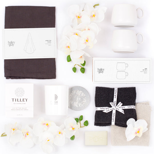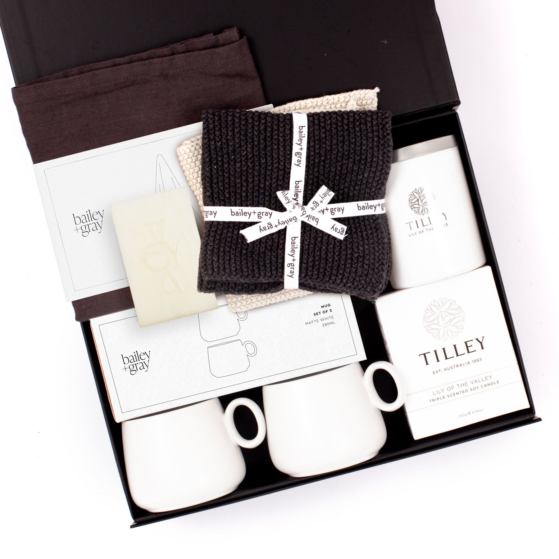 The Sip and Savour gift box is a thoughtful blend of comfort, elegance, and practicality. Perfect for someone who loves to slow down and enjoy life’s simple luxuries, this collection includes a beautifully scented Tilley soy candle, soft cotton wash cloths, and a pair of Bailey + Gray mugs for cozy moments with tea or coffee. A natural VEYA soap and a charcoal grey stonewashed linen tea towel add a touch of everyday indulgence, making this gift both stylish and useful. Ideal for housewarmings, thank yous, or simply showing someone you care.
