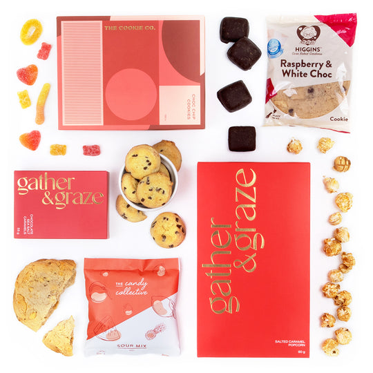 A little box of happiness for the sweet-toothed and snack-obsessed. The Sweet Society gift box is bursting with crunchy popcorn, gooey cookies, chewy lollies, and chocolatey indulgence—perfect for birthdays, thank-you, or anytime a sugar fix is in order.